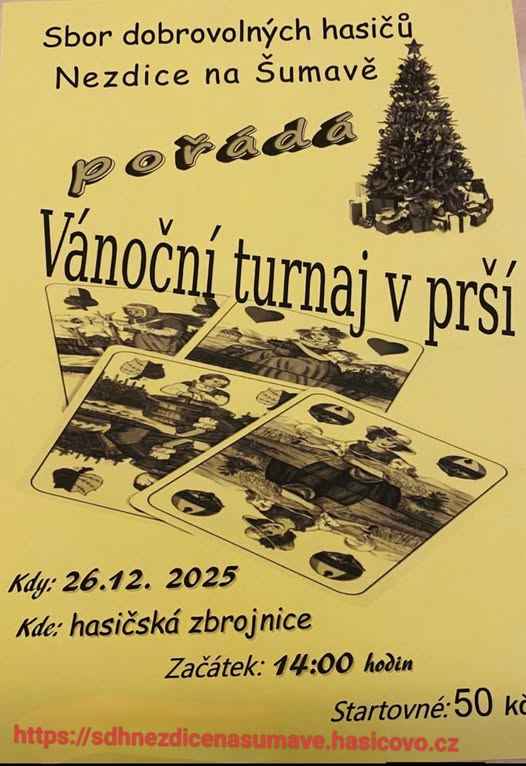Vánoční turnaj v prší 26.12. 2025 od 14:00 hodin v Hasičské zbrojnici.